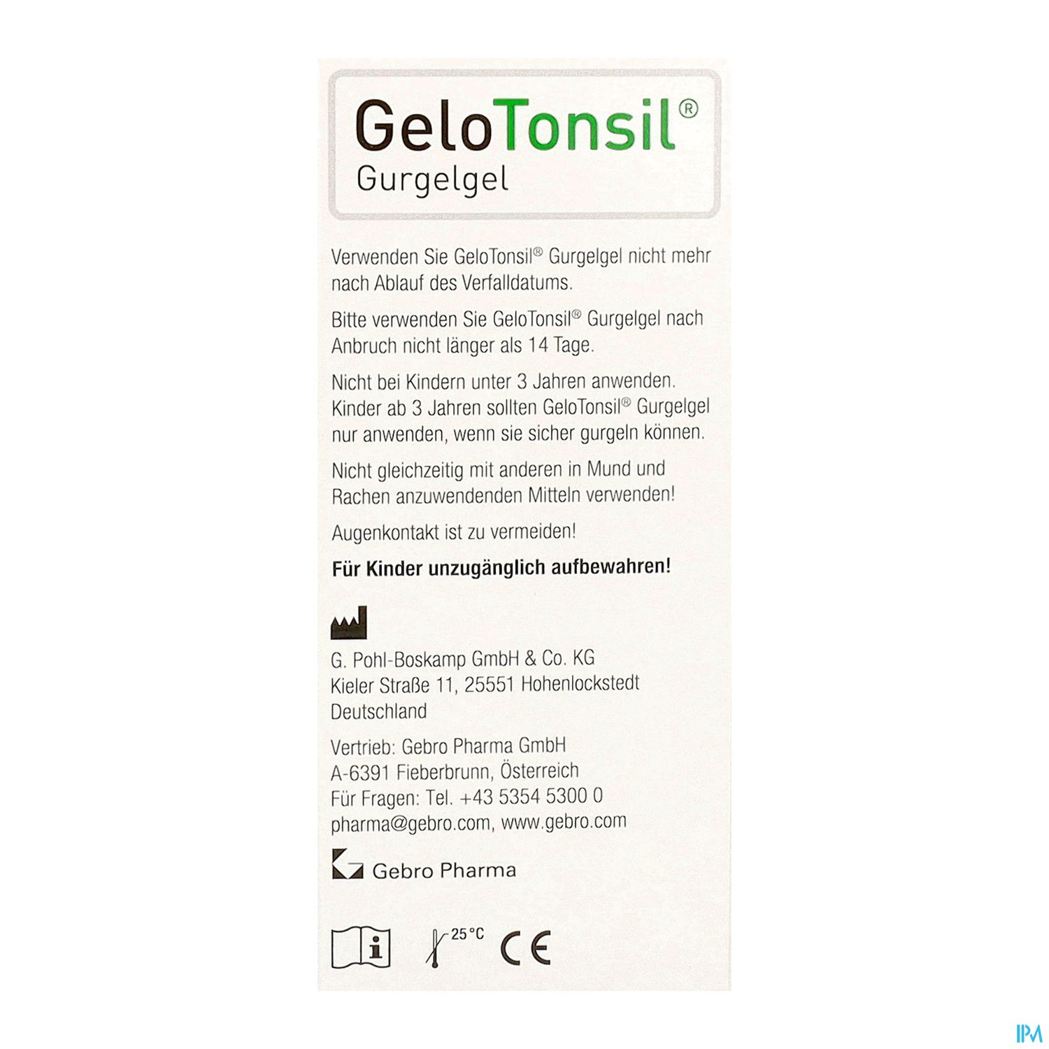 200 ml GeloTonsil® Gurgelgel beinhalten: • Xanthan • Natriumhyaluronat Durch die beiden gelbildenden Bestandteile überzieht ein Schutzfilm die entzündete Schleimhaut. Die Hyaluronsäure erhöht zudem das Feuchthaltevermögen. Weitere Bestandteile von GeloTonsil® Gurgelgel sind: • gereinigtes Wasser • Xylitol • Dexpanthenol • Dinatriumhydrogenphosphat • Citronensäure • Wasserstoffperoxid • Sucralose